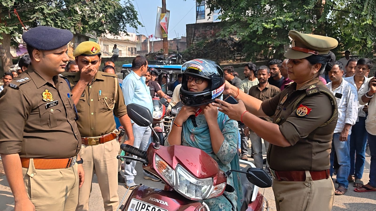 गौरव श्रीवास्तव,आजमगढ़। वरिष्ठ पुलिस अधीक्षक डॉ० अनिल कुमार के कुशल निर्देशन में तथा अपर पुलिस अधीक्षक (यातायात) विवेक त्रिपाठी के पर्यवेक्षण में “यातायात माह-2025” के अवसर पर आज दिनांक 05.11.2025 को क्षेत्राधिकारी नगर शुभम तोदी द्वारा थाना कोतवाली क्षेत्र स्थित काली मंदिर तिराहे पर विशेष यातायात जागरूकता कार्यक्रम आयोजित किया गया। इस दौरान क्षेत्राधिकारी नगर द्वारा दोपहिया वाहन चालकों को हेलमेट वितरित करते हुए सड़क सुरक्षा के नियमों का पालन करने हेतु जागरूक किया गया। वाहन चालकों को हेलमेट, सीट बेल्ट, गति नियंत्रण एवं मोबाइल का प्रयोग न करने जैसे नियमों की जानकारी दी गई। यातायात पुलिस आजमगढ़ द्वारा आमजन से अपील की जाती है कि यातायात नियमों का पालन करें, स्वयं सुरक्षित रहें और दूसरों को भी सुरक्षित रखें।
