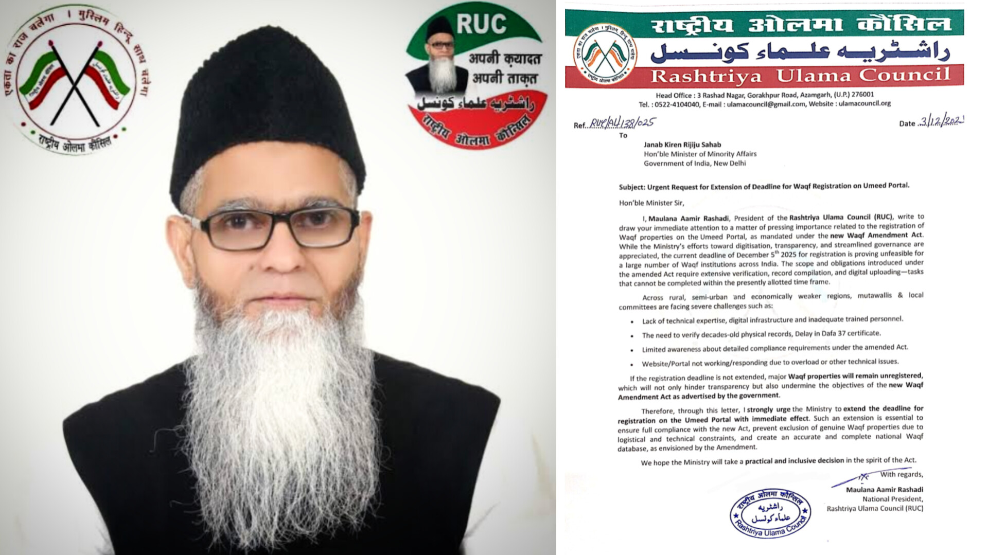 गौरव श्रीवास्तव,आजमगढ़। राष्ट्रीय उलेमा काउंसिल के अध्यक्ष मौलाना आमिर रशादी, नए वक्फ संशोधन अधिनियम के तहत अनिवार्य, उम्मीद पोर्टल पर वक्फ संपत्तियों के पंजीकरण से संबंधित एक महत्वपूर्ण मामले पर आपका तत्काल ध्यान आकर्षित करने के लिए लिखते हैं। जबकि डिजिटलीकरण, पारदर्शिता और सुव्यवस्थित शासन की दिशा में मंत्रालय के प्रयासों की सराहना की जाती है, पंजीकरण के लिए 5 दिसंबर 2025 की वर्तमान समय सीमा पूरे भारत में बड़ी संख्या में वक्फ संस्थानों के लिए अव्यवहारिक साबित हो रही है। संशोधित अधिनियम के तहत पेश किए गए दायरे और दायित्वों के लिए व्यापक सत्यापन, रिकॉर्ड संकलन और डिजिटल अपलोडिंग-कार्यों की आवश्यकता होती है जिन्हें वर्तमान में आवंटित समय सीमा के भीतर पूरा नहीं किया जा सकता है।