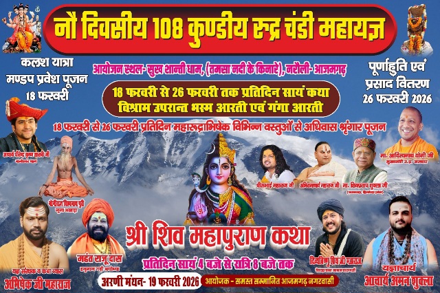 आजमगढ़। जनपद के नरौली स्थित तमसा नदी के पावन तट पर आगामी फरवरी माह में भक्ति और श्रद्धा का अनूठा संगम देखने को मिलेगा। यहाँ के ‘सुख शान्ति धाम’ में नौ दिवसीय 108 कुण्डीय रुद्र चंडी महायज्ञ एवं श्री शिवमहापुराण कथा का भव्य आयोजन होने जा रहा है। कलश यात्रा के साथ होगा शुभारंभ आयोजन की शुरुआत 18 फरवरी 2026 को भव्य कलश यात्रा और मण्डप प्रवेश पूजन के साथ होगी। 19 फरवरी 2026 को ‘अरणी मंथन’ का विशेष कार्यक्रम भी संपन्न किया जाएगा। आयोजन का समापन 26 फरवरी 2026 को पूर्णाहुति एवं विशाल प्रसाद वितरण (भंडारा) के साथ होगा। कथा और आरती का समय प्रतिदिन सायंकाल 4:00 बजे से रात्रि 8:00 बजे तक शिव महापुराण कथा का रसपान श्रद्धालु कर सकेंगे। कथा के विश्राम के उपरांत प्रतिदिन भव्य ‘भस्म आरती’ और ‘गंगा आरती’ का भी आयोजन किया जाएगा, जो भक्तों के लिए मुख्य आकर्षण का केंद्र होगा। प्रमुख संतों की गरिमामयी उपस्थितिइस धार्मिक अनुष्ठान में कथा व्यास के रूप में अभिषेक जी महाराज शिव महिमा का वर्णन करेंगे। साथ ही कार्यक्रम में आचार्य धीरेंद्र कृष्ण शास्त्री जी बागेश्वर धाम, उत्तर प्रदेश सरकार के मुख्यमंत्री योगी आदित्यनाथ, महंत राजू दास (हनुमानगढ़ी),आचार्य अमन शुक्ला (यज्ञाचार्य), योगी राज्य विश्वनाथ पुरी जूना अखाड़ा और अन्य प्रतिष्ठित संतों का सानिध्य प्राप्त होगा।