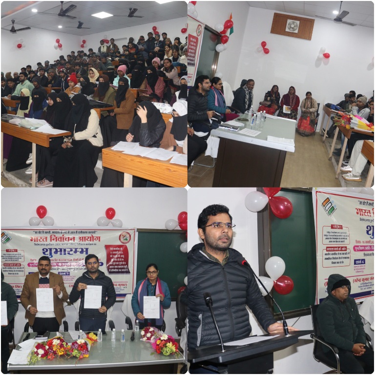 गौरव श्रीवास्तव /अमन गुप्ता,आजमगढ़। भारत निर्वाचन आयोग के निर्देशानुसार जनपद आजमगढ़ में विशेष प्रगाढ़ पुनरीक्षण-2026/मतदाता (वोटर) पंजीकरण कार्यक्रम का शुभारम्भ प्रभारी जिलाधिकारी/मुख्य विकास अधिकारी परीक्षित खटाना द्वारा आज शिब्ली नेशनल पीजी कॉलेज में किया गया। इस अवसर पर प्रभारी जिलाधिकारी/मुख्य विकास अधिकारी द्वारा जनपद के विधानसभा निर्वाचन क्षेत्रों की फोटोयुक्त निर्वाचक नामावलियों का आलेख्य प्रकाशन किया गया।इसके साथ ही अर्हता दिनांक-01.01.2026 के आधार पर विधान सभा निर्वाचन क्षेत्रों की निर्वाचक नामावली का आलेख्य प्रकाशन संबंधित निर्वाचक रजिस्ट्रीकरण अधिकारियों द्वारा आज जनपद में अवस्थित समस्त विधानसभा निर्वाचन क्षेत्रों के अन्तर्गत समस्त मतदेय स्थलों/पदाभिहीत स्थलों पर कर दिया गया है।प्रभारी जिलाधिकारी ने कहा कि मा0 भारत निर्वाचन आयोग के निर्देशानुसार अर्हता तिथि 01 जनवरी 2026 के आधार पर जिनकी आयु 18 वर्ष पूर्ण हो गया है, वे मतदाता अपना नाम मतदाता सूची बढ़ाने हेतु फार्म-6 घोषणा पत्र के साथ भरकर अपने बी०एल०ओ०/मतदाता पंजीकरण केन्द्र पर जमा कर सकते हैं। उन्होने बताया कि मतदाता सूची में नाम सम्मिलित एवं संशोधन इत्यादि के लिए भारत निर्वाचन आयोग की बेवसाइट https://voters.eci.gov.in पर अपने मोबाइल नंबर द्वारा आनलाइन आवेदन किया जा सकता है तथा आवेदन फार्म डाउनलोड भी किया जा सकता है। प्रभारी जिलाधिकारी ने युवाओं, छात्र/छात्राओं से अपील किया कि वे निर्वाचन सूची में अपना नाम अवश्य शामिल करवाएं। उन्होंने कहा कि युवा पीढ़ी देश के लोकतंत्र की रीढ़ है और उनकी सक्रिय भागीदारी ही मजबूत राष्ट्र निर्माण का आधार बनेगी। उन्होंने विशेष प्रगाढ़ पुनरीक्षण (एसआईआर) अभियान के तहत चल रही प्रक्रिया की जानकारी देते हुए बताया कि युवा मतदाताओं का पंजीकरण सुनिश्चित करने के लिए जिला प्रशासन द्वारा विभिन्न कदम उठाए जा रहे हैं। उन्होंने युवाओं को वोटर हेल्पलाइन ऐप, ऑनलाइन पोर्टल तथा बूथ लेवल ऑफिसर (बीएलओ) के माध्यम से नाम दर्ज कराने की सलाह दी। उप जिला निर्वाचन अधिकारी श्री राहुल विश्वकर्मा ने कहा कि मतदान न केवल एक अधिकार है, बल्कि कर्तव्य भी है। युवाओं को सक्रिय होकर इस प्रक्रिया में भाग लेना चाहिए, ताकि आगामी निर्वाचनों में पूर्ण मतदाता भागीदारी सुनिश्चित हो सके। उन्होने सभी युवाओं से अपील किया कि आज से प्रारंभ हो चुके एसआईआर अभियान का लाभ उठाएं और निर्वाचन सूची में अपना नाम शामिल करवाएं। अधिक जानकारी हेतु वोटर हेल्पलाइन 1950 पर संपर्क करें या nvsp.nic.in पर विजिट करें।कार्यक्रम मे प्रतिभागी युवाओं, छात्र-छात्राओं द्वारा फॉर्म 6 भरकर संबंधित ईआरओ एवं बीएलओ को उपलब्ध कराया गया।इस अवसर पर उप जिला निर्व