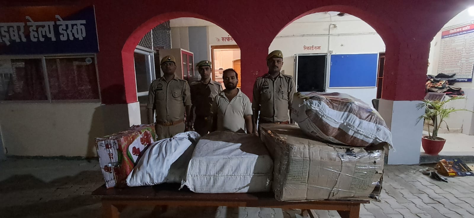 बरामद वस्तुओं का विवरण- एक बड़ा गत्ता, एक छोटा गत्ता व तीन बोरों में रखी गई निम्नलिखित विस्फोटक सामग्री (पटाखे):- मोरी छाप पटाखा –100 पैकेट• महाबीर छाप छूरछूरी – 60 पैकेट- चिमा छाप पटाखा – 60 पैकेट• स्पेरेन्ट लगा – 03 पैकेट•कमांडो बम पटाखा – 20 पीस•लाईट छूरछूरी – 120 पैकेट•चकरी – 05 पीस• सुतरी पटाखा माउस – 06 पैकेट• रॉकेट बम – 10 पैकेट•ताज पटाखा (50 लड़ी MV, CossAiv) – 25 पीस• मिट्टी का अनार – 97 पीस*कानूनी कार्रवाई –*अभियुक्त का यह कार्य धारा 9(B)(1)(A) विस्फोटक अधिनियम 1984 एवं धारा 125, 287 बी.एन.एस. के अंतर्गत दंडनीय अपराध पाए जाने पर कारण गिरफ्तारी बताते हुए समय 16:57 बजे नियमानुसार हिरासत पुलिस में लिया गया। आवश्यक वैधानिक कार्यवाही प्रचलित है।